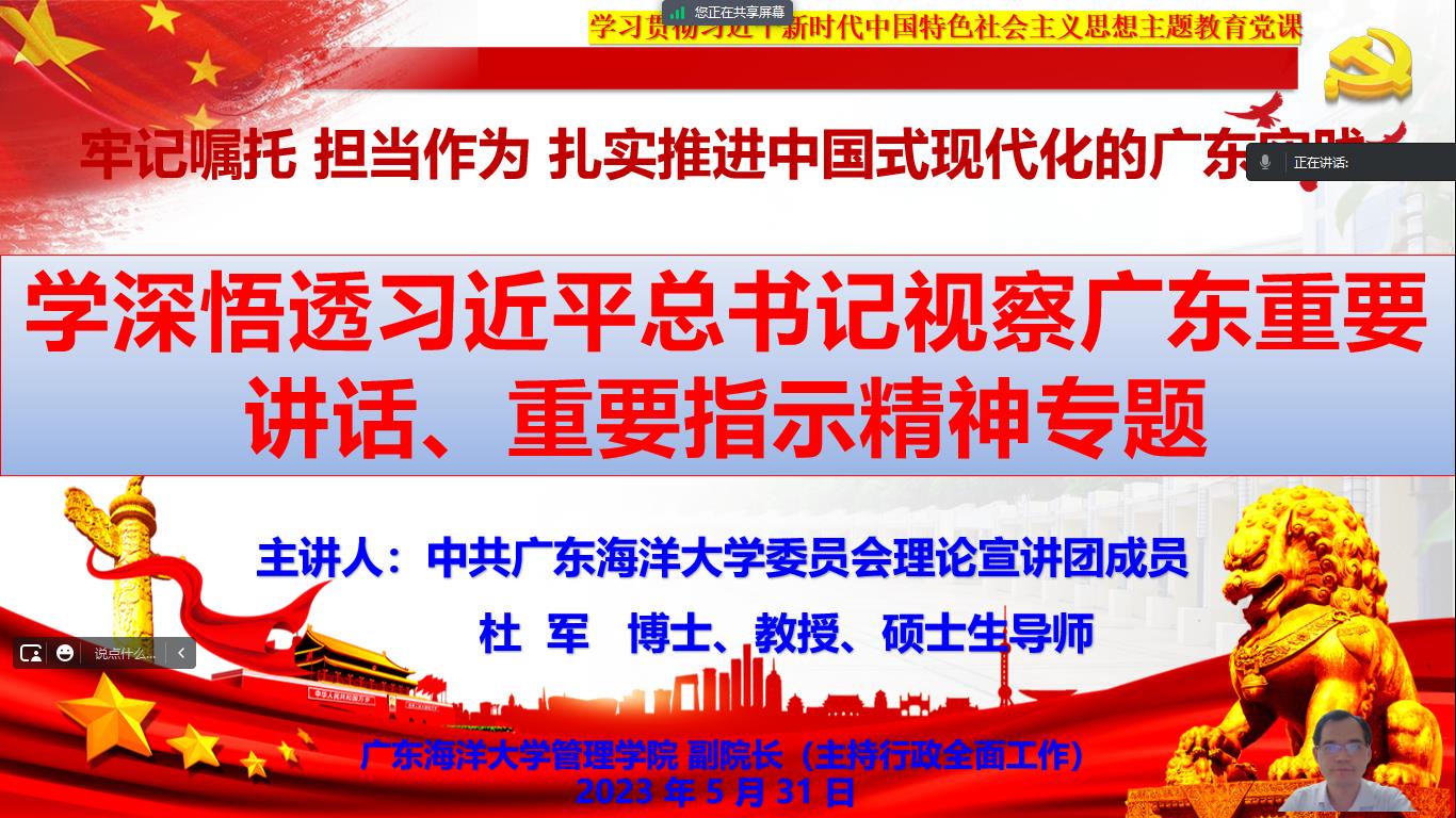 杜军教授在授课中紧扣习近平总书记视察广东重要讲话重要指示精神,以翔实的数据及图文并茂分析和讲解了推动中国式现代化中的广东实践。勉励全体党员同志切实提高政治站位,不断增强“四个意识”、坚定“四个自信”、做到“两个维护”,统一思想、统一意志、统一行动,不忘初心、牢记使命,以一往无前的奋斗姿态、风雨无阻的精神状态,推动广东在全面建设社会主义现代化国家新征程中走在全国前列、创造新的辉煌,实现广东高质量、高水平发展,以实际行动响应习近平总书记对广东的殷切关怀,为实现第二个百年奋斗目标、实现中华民族伟大复兴的中国梦做出新的更大贡献!号召公司广大师生党员要带头示范,要充分发挥伟德国际1946bv的涉海特色优势,依托公司紧邻南海,拥有水产、食品、海洋一级学科博士点及多个涉海学科基础,服务于广东海洋强省建设,着力在海洋经济管理、现代化海洋牧场、水产种业、红树林生态保护、特色农业等领域积极作为、勤奋钻研,贡献海大人的力量。