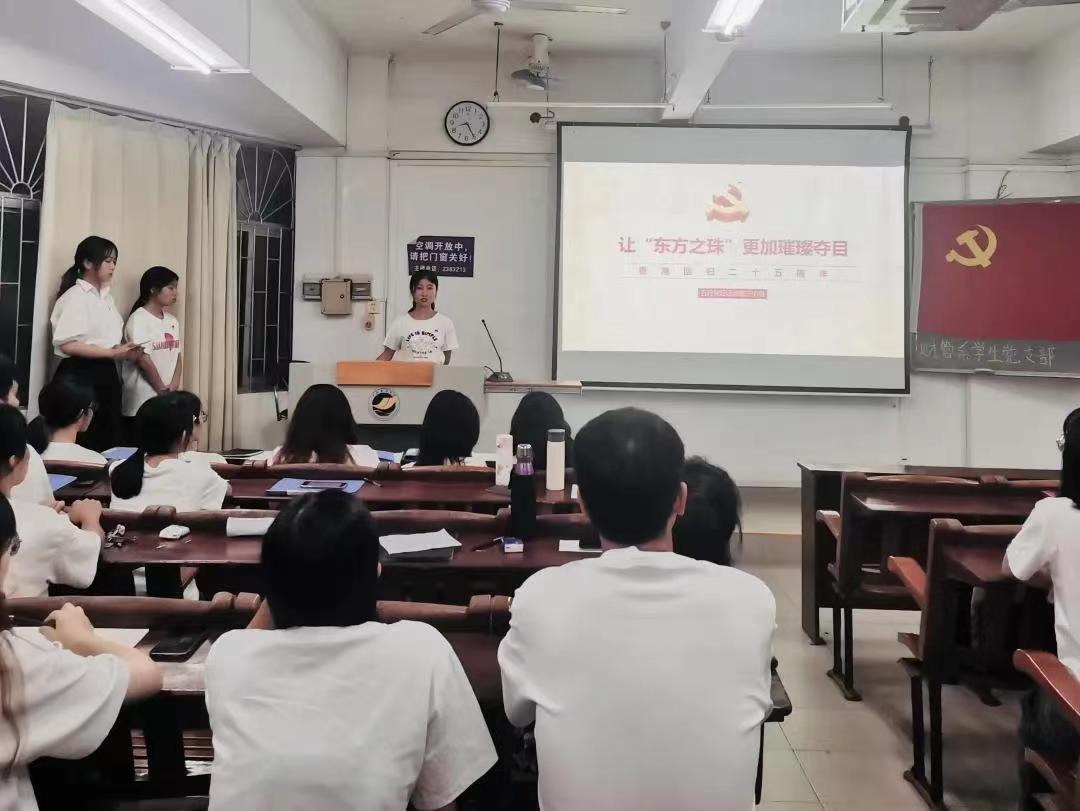 最后,进行主题汇报,每一小组的主题有所不同,为了契合2022年来的热点话题,分别选择了五四青年、建团一百周年、香港回归二十五周年、庆祝中国人民解放军建军95周年主题。邓蔓婷同志分享了香港回归以来香港文化的传播和影响,方圆同志分享了南昌起义的背景故事以及建军节的由来。每一小组在汇报时,从各方面全方位向大家介绍内容,配备了相关视频,增加汇报的趣味性,使各位党员同志能够充分了解今年的时事热点,同时能够明白在这些主题背景下应该如何做一名合格党员,充分发挥先锋模范作用。