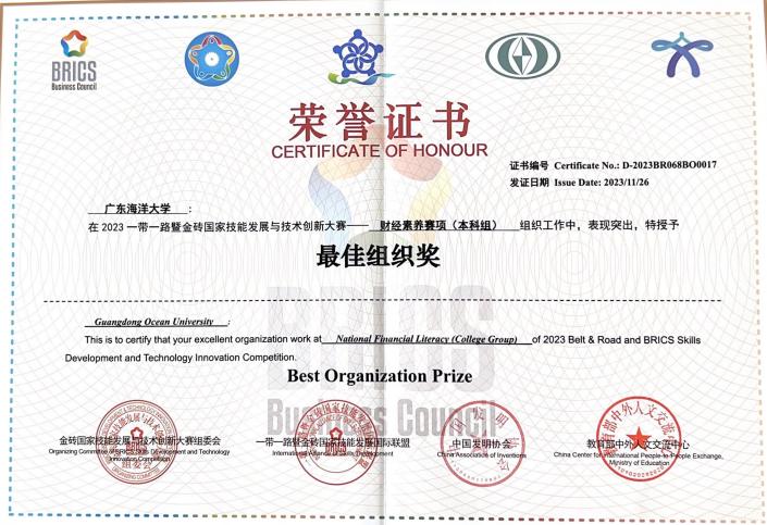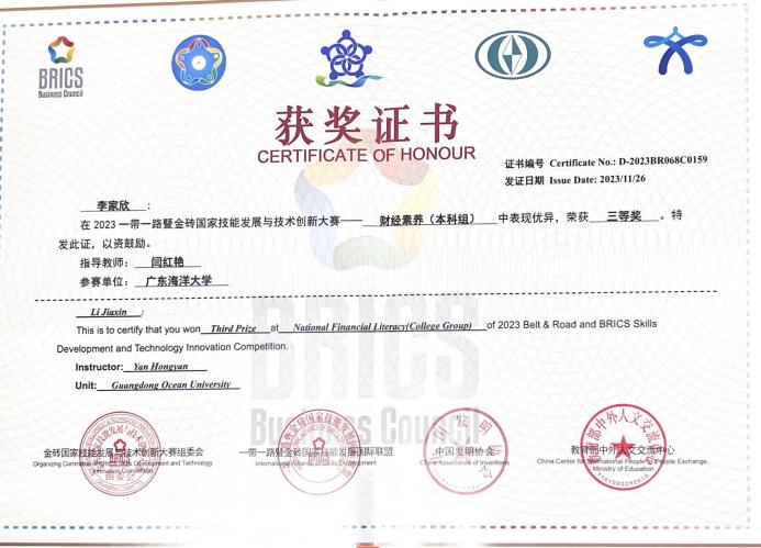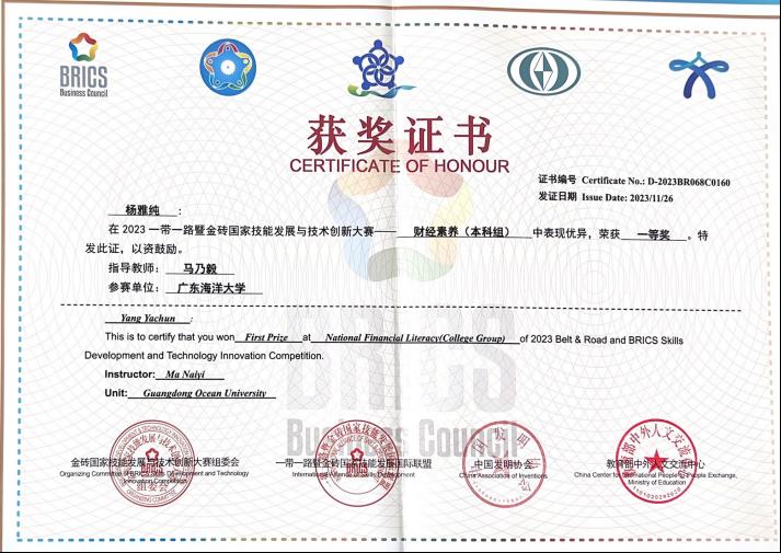 11月27日,2023“一带一路”暨金砖国家技能发展与技术创新大赛之财经素养赛项(本科组)决赛在中南财经政法大学举办。此赛项系2023年全国普通高校老员工竞赛榜单内竞赛项目,公司bevitor伟德国际1946会计系马乃毅、闫红艳、刘丹三位老师带队率领2021级会计专业杨雅纯和2022级会计专业李家欣两名同学代表公司参赛。通过激烈竞争,公司两支代表队分别获得国内组一等奖和国内组三等奖,公司获得“最佳组织奖”。