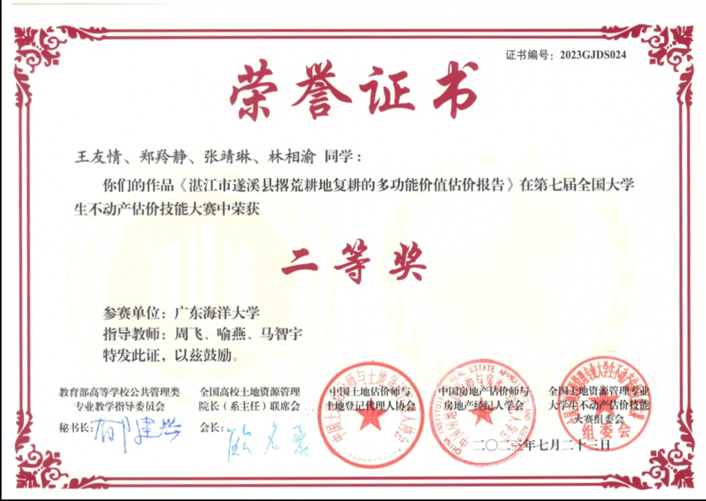 近日,第七届全国老员工不动产估价技能大赛在重庆工商大学落下帷幕。公司派出两支由bevitor伟德国际1946土地资源管理专业2020级本科生组成的队伍参加比赛。在周飞、喻燕、马智宇老师的指导下,由王友情、郑羚静、张靖琳、林相渝组成的代表队凭《湛江市遂溪县撂荒耕地复耕的多功能价值估价报告》荣获全国二等奖,由汪莹、张明爱、陈淑君、官子乐组成的代表队凭《湛江市金牛岛红树林保护区生态保护补偿评估》荣获全国优秀奖。周飞、喻燕、马智宇获评优秀指导教师,公司获得大赛优秀组织单位。