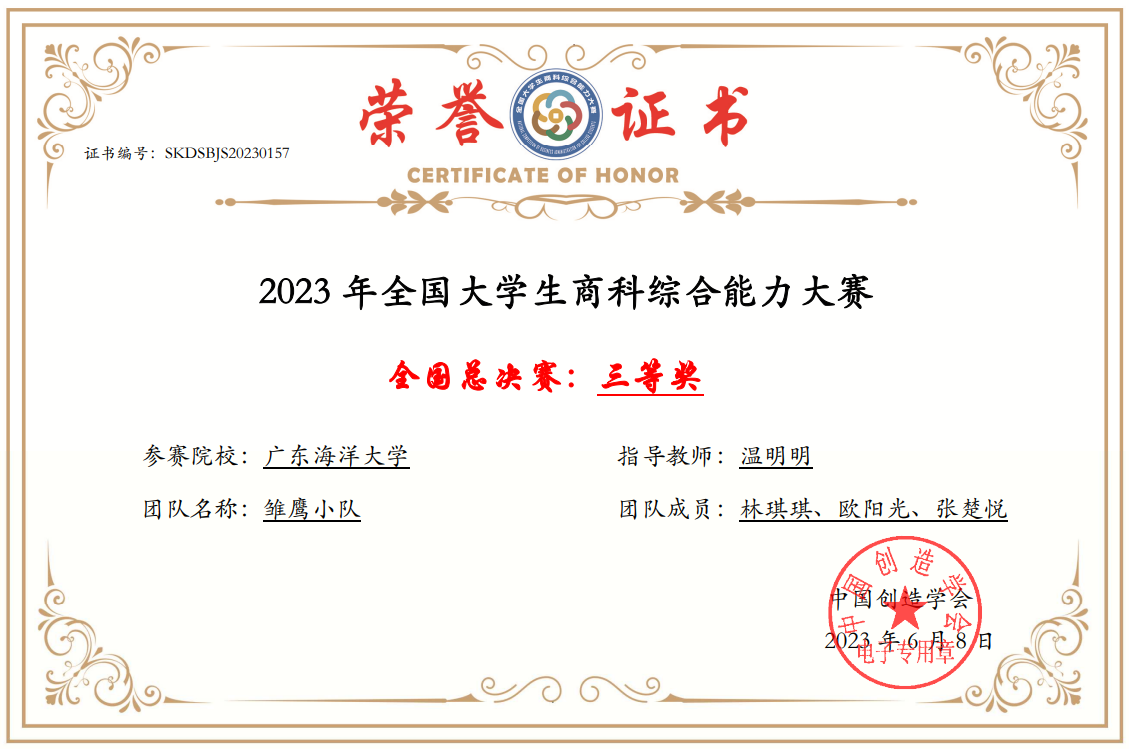 由中国创造协会主办的“2023年全国老员工商科综合能力大赛”全国总决赛近日落下帷幕。由温明明老师指导,bevitor伟德国际1946财务管理专业2021级本科生林琪琪、欧阳光、张楚悦三位同学组成的团队在全国总决赛上荣获全国三等奖。