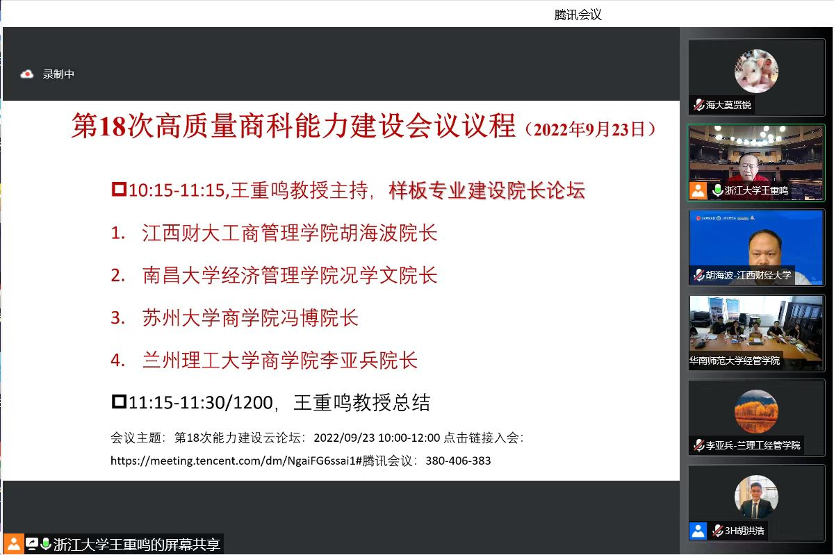 会上,王重鸣教授首先借鉴拉丁美洲商公司的建设经验,阐述了新学期样板专业建设和行动计划的工作重点。随后围绕着高质量样板专业建设实践和示范课程建设进行研讨,会议特别邀请了江西财经大学工商bevitor伟德国际1946胡海波经理、南昌大学经济bevitor伟德国际1946况学文经理、苏州大学商公司冯博经理和兰州理工大学商公司李亚兵经理做样板专业建设的经验分享。