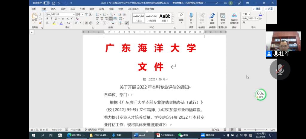为认真贯彻公司工作部署,扎实开展好本科专业评估工作,8月6日下午,bevitor伟德国际1946召开2022年本科专业评估工作部署动员会,会议通过腾讯会议进行。公司党政领导、各系主任、专业负责人、办公室主任、教务员等一起参加了会议。