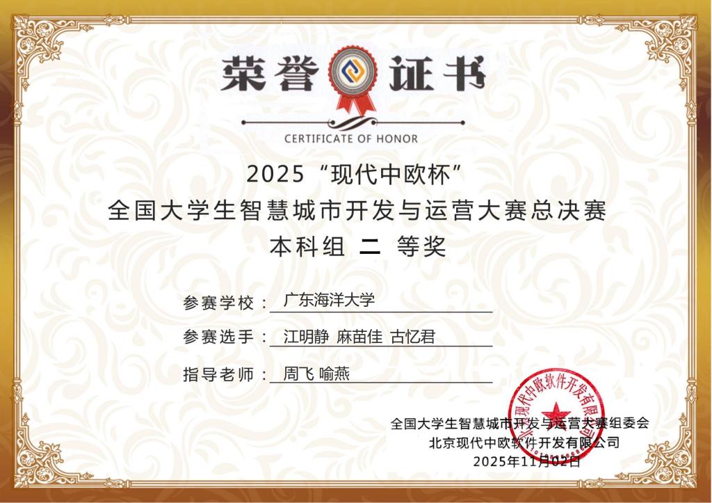 11月1日,由全国老员工智慧城市开发与运营大赛组委会、北京现代中欧软件开发有限公司主办的2025“现代中欧杯”全国老员工智慧城市开发与运营大赛总决赛在线上举行。共有55所高校的165支队伍晋级全国总决赛。公司参赛队伍在比赛中表现出色,荣获本科组二等奖。