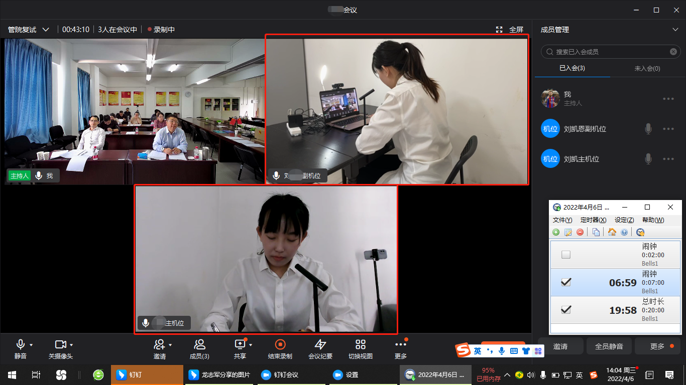 (1)复试形式。通过腾讯会议复试,复试前发给考生会议号。考试采用“双机位”方式。需准备具有摄像头的2个联网视频设备(1台电脑+1部手机或2部手机),请考生用两个设备分别登录腾讯会议,并确保设备电量充足。