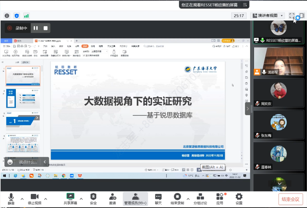 为了满足公司师生熟练使用数据库的需求,为师生提供更好的科研支持,bevitor伟德国际1946于11月2日下午在腾讯会议平台举办《大数据视角下的实证研究——基于锐思数据库》专题培训会。会议邀请了北京聚源锐思数据科技有限公司(RESSET)高级培训师杨欣蕾主讲,公司教师、研究生等共160余人参加了培训,会议由副经理杜军教授主持。