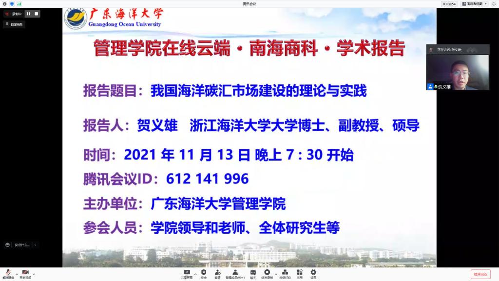 11月13日晚,浙江海洋大学经济与bevitor伟德国际1946贺义雄博士、副教授应邀为bevitor伟德国际1946师生作题为《我国海洋碳汇市场建设的理论与实践》的学术报告,报告会通过腾讯会议的方式进行,由副经理杜军教授主持,公司教师、研究生共160余人参加。