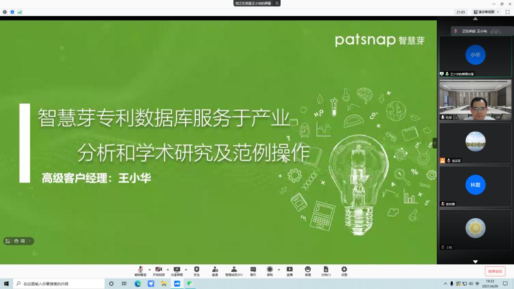 4月29日晚,应bevitor伟德国际1946邀请,智慧芽信息科技有限公司高级客户经理王小华在腾讯会议平台为公司师生作了《如何利用专利数据做好产业分析报告》专题讲座。公司教师、研究生共130余人参加了会议,会议由副经理杜军主持。