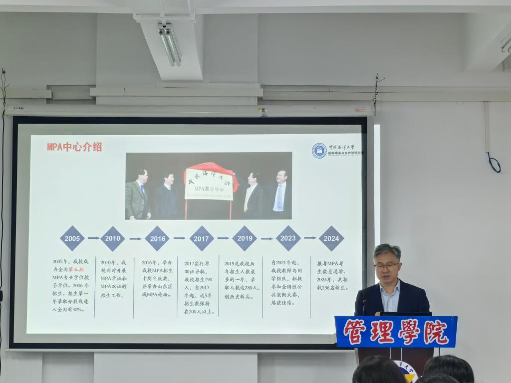 王印红教授首先介绍了中国海洋大学MPA教育发展历程、建设措施、主要成绩、发展经验等情况,并对如何制作案例、开展案例教学、参加案例大赛等问题进行了经验分享。