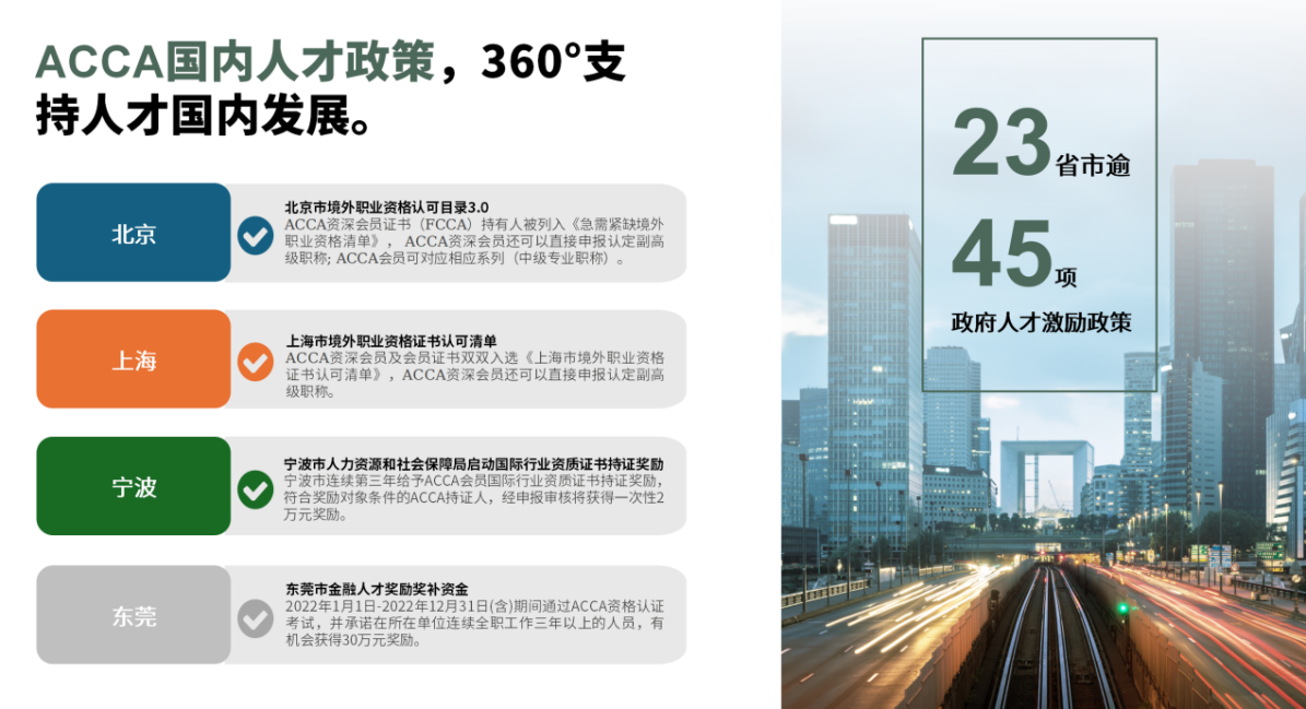 ACCA已被北京、广州、深圳、上海、珠海等 23个省、市列入高端财会金融紧缺人才引进计划,享受落户政策、现金奖励、股权奖励、购车购房减免税等等人才福利。