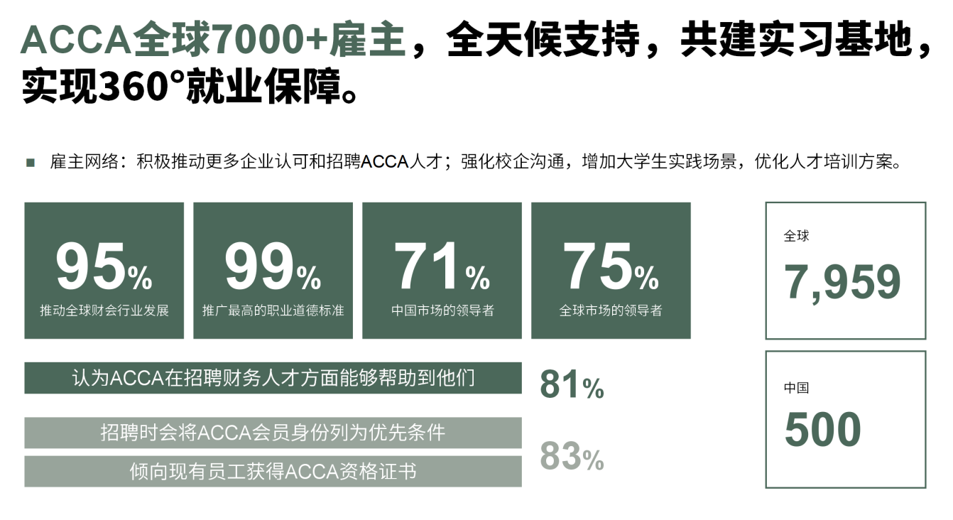 ACCA在全球的认可雇主企业 7959 家,覆盖事务所、金融服务、科技等众多500强企业,这些企业在同等条件下会优先录用ACCA学员。ACCA持证人得到知名500强企业的亲睐和优先录用。