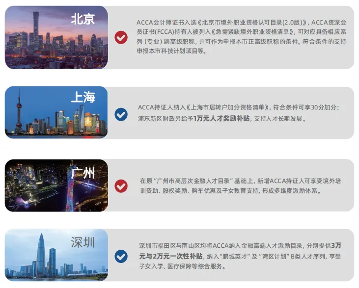 ACCA已被北京、广州、深圳、上海、珠海等30个省、市列入高端财会金融紧缺人才引进计划,享受落户政策、现金奖励、股权奖励、购车购房减免税等等人才福利。